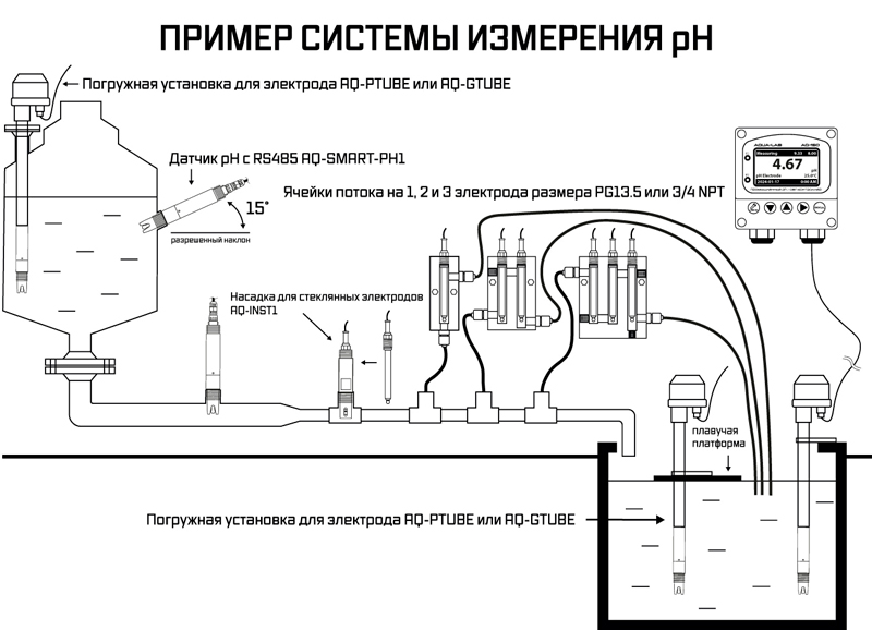 Параметр Значение AQUA-LAB AQ-150 (220В) AQUA-LAB AQ-150 (24В) AQUA-LAB AQ-150-RS-485 (220В) AQUA-LAB AQ-150-RS-485 (24В) Тип измерения pH и/или ОВП Диапазон измерения рН 0,0 ~ 14,0 Диапазон измерений ОВП 0 ~ ±1999 мВ Диапазон измерения температуры 0 ~ 100 °C Потребляемая мощность ≤5 Вт Питание 220 В 24 В 220 В 24 В Длина провода максимальное удлинение на 30 метров, с усилителем сигнала AQ-F4-FD до 1000 метров Цена деления pH 0,01 Цена деления ОВП 1 мВ Погрешность измерения pH ± 0,01 Погрешность измерения ОВП ±1 мВ Автоматическая компенсация температуры (АТС) есть Температурная компенсация PT1000, NTC10K, ручная Буферная группа 4,00-6,86, 6,86-9,18, 4,00-7,00, 7,00-10,00 Автоматическая термокомпенсация 0 - 100 °C Токовый выход 2 х 4-20 mA максимальная нагрузка 500Ω Релейный выход 2 штуки верхняя и нижняя точка срабатывания, гибкие настройки реле Размер выреза для встраивания в панель/шкаф 92,5 х 92,5 мм Стабильность датчика ≤ 0,02 pH/24 часа; ≤ 3 мВ/24 часа Класс защиты IP65 Рабочий диапазон температуры 0 ~ 60 °C Рабочий диапазон влажности не более 85 % RH Выходы 4-20 мА токовая петля RS-485 Modbus/RTU и 4-20 мA -
