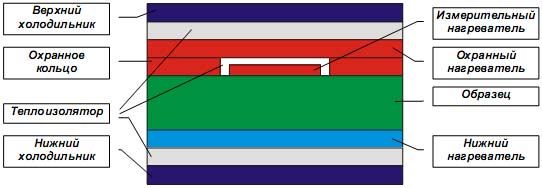 Охранный нагреватель и охранное кольцо предназначены для исключения потерь из измерительного нагревателя. Температура охранного нагревателя и охранного кольца поддерживается равной температуре измерительного нагревателя. Таким образом, обеспечивается тепловой поток от измерительного нагревателя к нижнему нагревателю через образец.