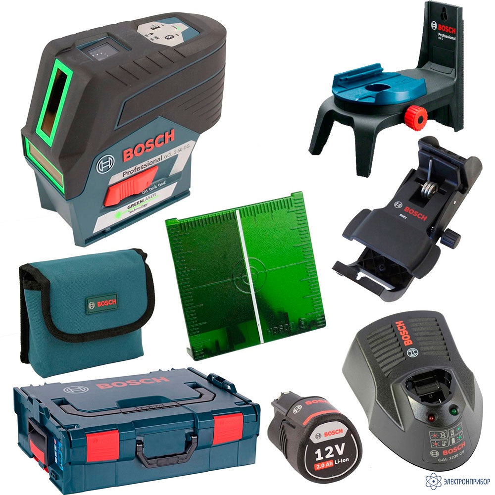 № Наименование Количество 1 Лазерный уровень Bosch GCL 2-50 CG 1 2 GCL 2-50 C/CG вкладыш 1 1 3 GCL 2-50 C/CG вкладыш 2 1 4 Лазерный отражатель 1 5 Чехол 1 6 Быстрозарядное устройство GAL 1230 CV 1 7 Поворотное крепление RM2 1 8 Аккумулятор GBA 12V 2.0Ah 1 9 Аккумуляторная дрель-шуруповерт Bosch GSR 12V 1