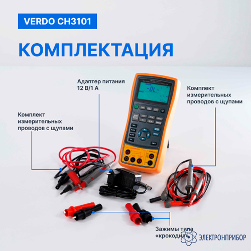 № Наименование Количество 1 Калибратор процессов с функцией измерения, 0,05% VERDO CH3101 1 2 Комплект измерительных проводов с щупами 2 3 Комплект зажимов типа «крокодил» 2 4 Адаптер питания 12 В/1 А 1 5 Кейс для хранения и переноски 1 -