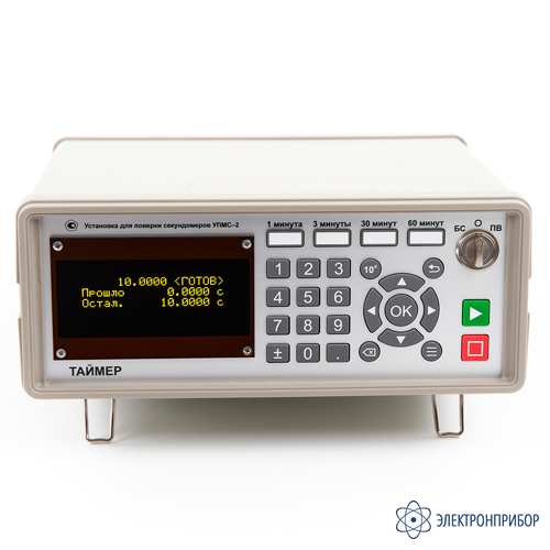 δОП = 10-7 в течение 1 суток после настройки.Основные параметры при поверке электрических и электронных секундомеров с механическим запуском Диапазон задаваемой длительности интервала времени 5–4·105 с Пределы допускаемой абсолютной погрешности ±(2·10-2 + TИНТ·δОП) с Количество одновременно проверяемых секундомеров в одном блоке секундомеров до 10 штук Количество одновременно подключенных блоков секундомеров к одному таймеру до 4 штук Усилие нажатия на каждый секундомер не менее 20 Н Основные параметры в режиме генератора периодического сигнала Диапазон задаваемой длительности периода 2·10-4–4·105 с Диапазон задаваемой длительности импульса 1·10-4–4·105 с Пределы допускаемой абсолютной погрешности ±(1,5·10-6 + TИНТ·δОП) с Дискретность установки интервала времени 10-4 с Напряжение на выходе опорного генератора 2,5–5,3 В Допустимое сопротивление нагрузки не ниже 50 Ом Основные параметры установки Напряжение питающей сети 198 – 253 В, частота питающей сети 50 ± 1 Гц Потребляемая мощность не более таймер 20 Вт, блок секундомеров 1300 Вт Диапазон рабочих температур 10–35 °С Габаритные размеры (длина×ширина×высота), не более таймер 245×260×115 мм