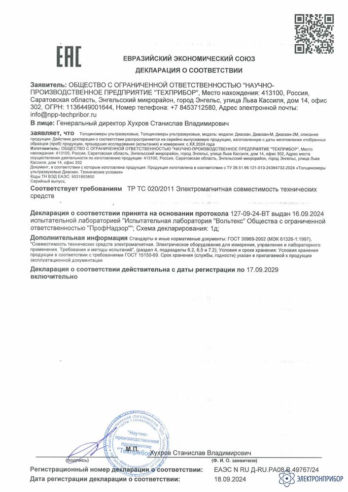 Технические характеристики толщиномера ультразвукового ДИАСКАН: