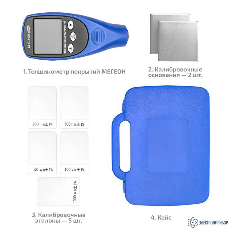 № Наименование Количество 1 Толщиномер покрытий МЕГЕОН 19011 1 2 Калибровочный эталон 5 3 Калибровочное основание 2 4 Руководство по эксплуатации 1 5 Футляр 1 -