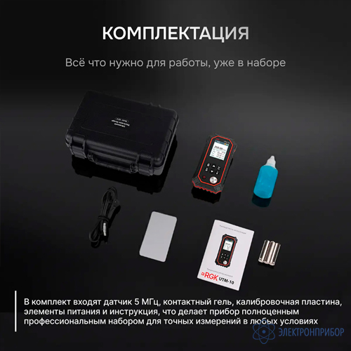 № Наименование Количество 1 Толщиномер RGK UTM-10 1 2 Батарея 1,5 В, AA 3 3 Контактный гель 1 4 Датчик (5 MHz ∅ 10) 1 5 Жесткий кейс 1 6 Руководство по эксплуатации 1 -