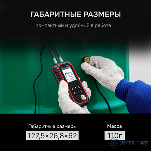 Параметр Значение Диапазон измерения от 1 до 300 мм (сталь), метрическая и дюймовая система Диапазон скорости звука от 1000 до 9999 м/с Разрешение 0,1 мм/0,01 мм/0,01 дюйма — три доступных разрешения Точность отображения ±(0,5%*H+0,04) мм Встроенная память 300 показаний Основные функции одиночное измерение, непрерывное измерение, измерение с сигналом тревоги, измерение скорости звука, калибровка Единицы измерения мм/дюйм Батарея 3x1,5 В AA Время работы >20 часов Размер 127,5 x 62 x 26,8 мм Вес 110 г *Н – толщина измеряемого покрытия -