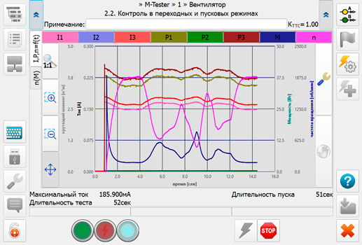 - Контроль пусковых режимов ЭМ, проводимый с регистрацией токов и напряжений питающей сети, скорости вращения ротора и с определением расчетного момента на валу электродвигателя.