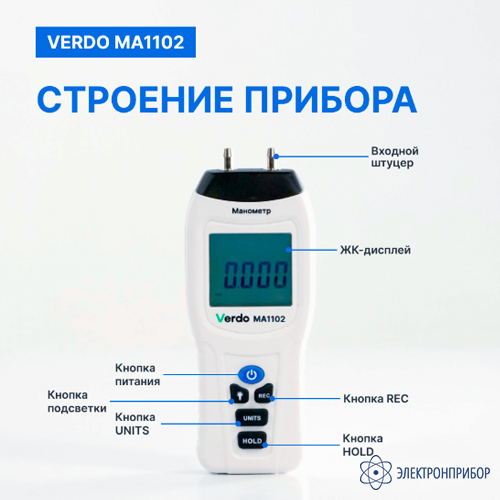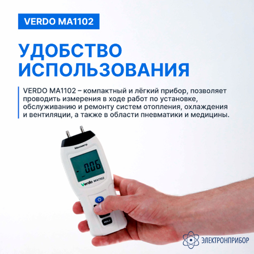 Verdo МА1102 представляет собой компактный и лёгкий дифференциальный манометр, предназначенный для точного измерения разницы давлений между двумя точками в воздушных и газовых системах.
