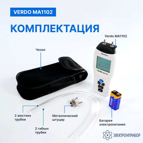 № Наименование Количество 1 Манометр дифференциальный, ±34,47 кПа/±0,3% VERDO MA1102 1 2 Трубка жесткая 2 3 Трубка гибкая 2 4 Металлический штуцер 2 5 Батарея электропитания 9В 6F22 (опционально) 1 6 Чехол 1 7 Руководство по эксплуатации 1 -