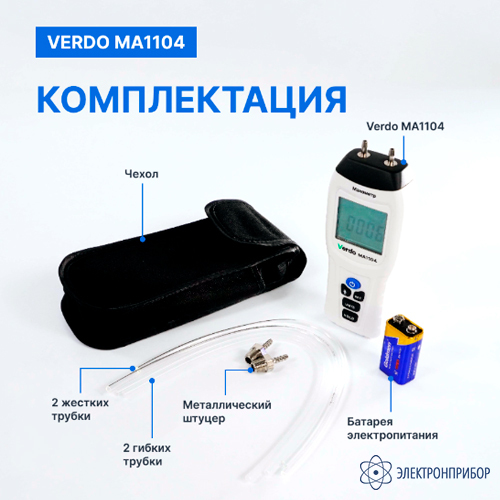 № Наименование Количество 1 Манометр дифференциальный, ±206,8 кПа/±0,3% VERDO MA1104 1 2 Трубка жесткая 2 3 Трубка гибкая 2 4 Металлический штуцер 2 5 Батарея электропитания 9В 6F22 (опционально) 1 6 Чехол 1 7 Руководство по эксплуатации 1 -