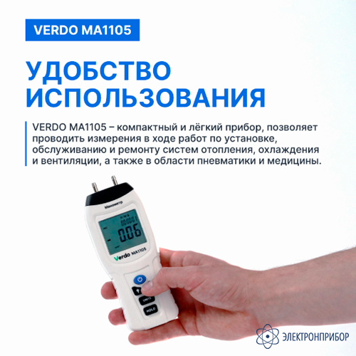 Устройство способно работать с различными единицами измерения давления, включая Па, мбар, кПа, дюймы водяного столба и другие. Высокая точность измерений делает Verdo МА1105 универсальным инструментом, который находит применение в различных областях, где требуется высокая точность, таких как системы отопления, вентиляции, кондиционирования воздуха, а также в инженерных и промышленных системах.