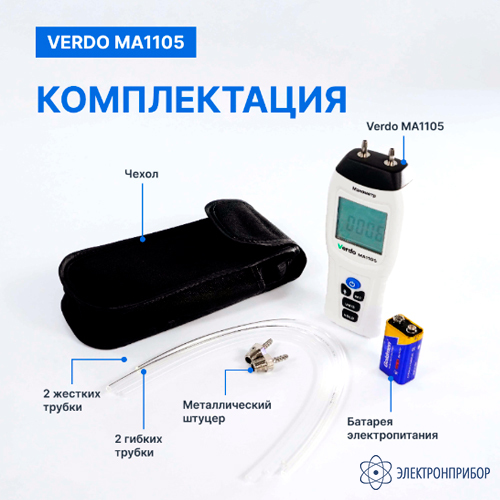 № Наименование Количество 1 Манометр дифференциальный, ±517,1 кПа/±0,3% VERDO MA1105 1 2 Трубка жесткая 2 3 Трубка гибкая 2 4 Металлический штуцер 2 5 Батарея электропитания 9В 6F22 (опционально) 1 6 Чехол 1 7 Руководство по эксплуатации 1 -