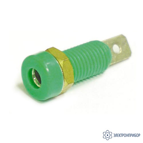 Гнездо (розетка) 641-green с внутренним диаметром 4 мм, с ножевым соединением с контактным отверстием диаметром 2 мм. Гаечное крепление с шайбой, общая длина 28 мм. Цвет зеленый.