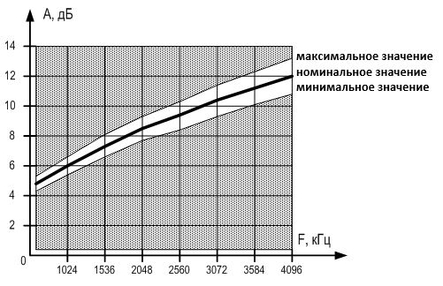 Кратность полу-тактовой частоте Частота, кГц Затухание, дБ Номинальное Минимальное (-10%) Максимальное (+10%) 1 1024 6,0 5,40 6,60 1,5 1536 7,34 6,60 8,10 2 2048 8,50 7,65 9,35 2,5 2560 9,40 8,46 10,34 3 3072 10,40 9,36 11,44 3,5 3584 11,20 10,08 12,32 4 4096 12,00 10,80 13,20 Характеристика