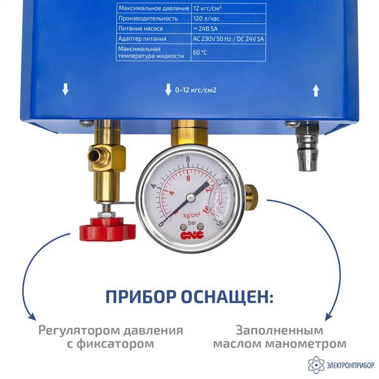 Опрессовочный насос электрический МЕГЕОН 98112 предназначен для опрессовки и проверки герметичности трубопроводов в системах водоснабжения и отопления. В изделии использован насос вибрационного типа с электроприводом для нагнетания высокого давления (12 кгс/см2), регулятор с редукционным клапаном, отградуированный в двух единицах измерения манометр для контроля выходного давления. Прибор укомплектован фильтром для грубой очистки от мелких частиц, всеми необходимыми для работы шлангами и складной ёмкостью для жидкости, имеет удобную ручку для переноски, небольшой вес и размеры. Инструмент рассчитан на питание от источника постоянного тока с напряжением 24 В, а также в комплект входит адаптер для подключения к электросети 230 В 50 Гц, потребляемая мощность составляет не более 150 Вт в зависимости от нагрузки.