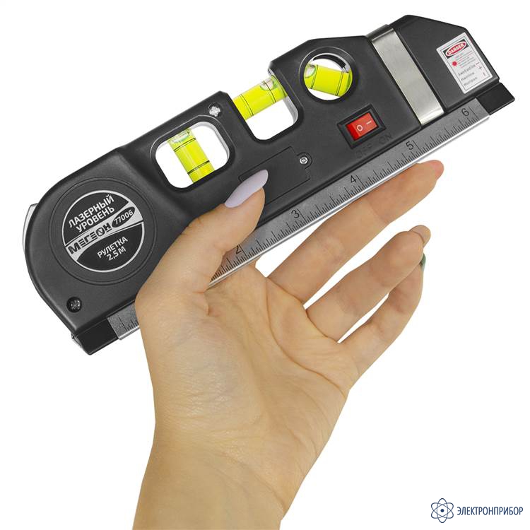 МЕГЕОН 77006 – это многофункциональный инструмент "4 в 1", который оснащён линейкой и рулеткой с двойной оцифровкой, тремя пузырьковыми уровнями и лазерным осепостроителем, что улучшает его потребительские свойства. Луч хорошо виден на расстоянии до 15 метров. Такие обширные возможности могут использоваться как совместно друг с другом, так и независимо по отдельности. Надежный помощник в строительстве и ремонте.
