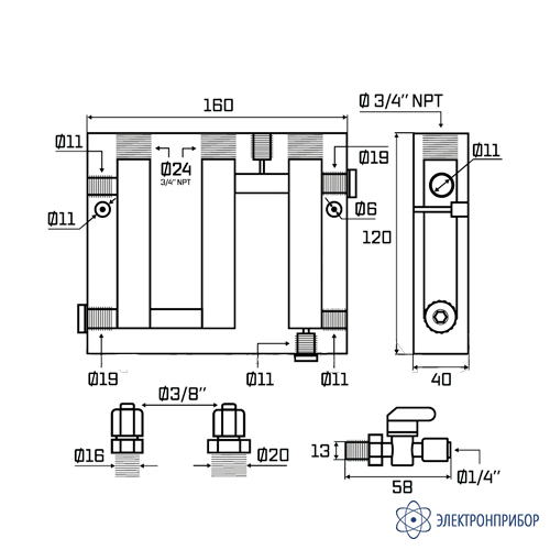 Параметр Значение Температура жидкости 0-60 °C Материал корпуса акрил Диаметр 3/4" NPT для 3-х датчиков Размеры 160 х 120 х 40 мм Вес 700 г -