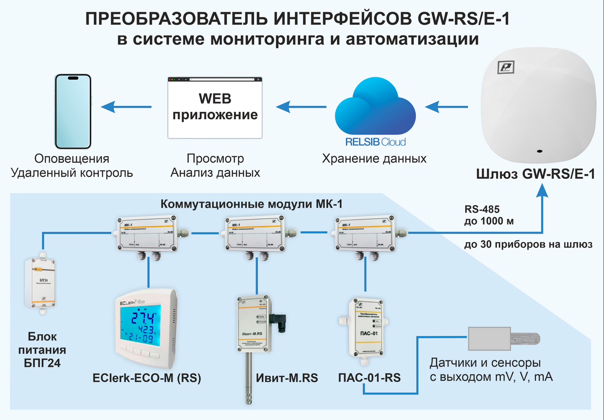 Преобразователь интерфейсов GW-RS/E-1 предназначен для приёма данных по RS-485 Modbus с приборов, имеющих интерфейс RS-485 (ПАС-01, Ивит-М, ДВТ-03, EClerk-Eco-M и других) с последующей передачей данных по Ethernet в облачный сервис RelsibCloud.
