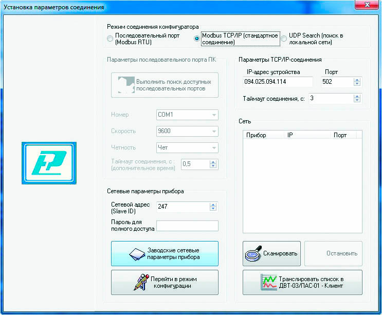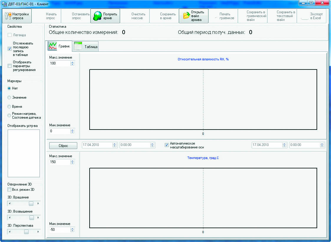 Прибор поставляется совместно с программой-конфигуратором ПАС-ДВТ, которая постоянно совершенствуется и распространяется бесплатно. Программа имеет удобный графический интерфейс, позволяющий легко работать с программой. При помощи программы можно не только производить поиск, регистрацию и конфигурирование приборов в сети, но также регистрировать данные измерений с представлением информации в виде таблицы и графика.