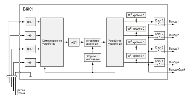 Датчик уровня подключается к входным фильтрам низких частот (ФНЧ1...ФНЧ4). Далее через коммутационное устройство (КУ) сигнал поступает на аналого-цифровой преобразователь (АЦП). В устройстве сравнения (УС) происходит сравнение уровня оцифрованного сигнала датчика со значением уставки опорного напряжения (ОН). Значение уставки опорного напряжения выбирается DIP-переключателем установки порога срабатывания. Устройство управления (УУ) выполняет функцию выбора канала измерения датчика уровня и управления соответствующим выходным ключом (Ключ 1...Ключ 4). Срабатывание выходного ключа происходит при контакте соответствующего сигнального электрода с жидкостью, одновременно засвечивается соответствующий светодиод «Уровень».