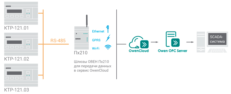 Диспетчеризация. Наличие интерфейса RS-485 на борту контроллеров, позволяет включать их в системы диспетчеризации. Информацию с приборов можно передавать на ОРС- серверы, SCADA-системы, облачные сервисы. В ОВЕН ОРС-сервер и облачном сервисе OwenСloud представлены готовые шаблоны для КТР-121.