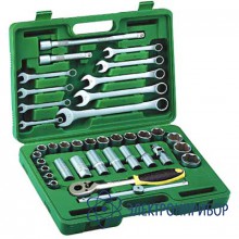 № Наименование Количество 1 Комплект головок 1/2": 10-24; 27; 30; 32 мм 1 2 Комплект длинных головок 1/2": 10; 13; 17; 19 мм 1 3 Ключ трещоточный с быстрым сбросом 1/2" 1 4 Удлинители 125 и 250 мм 1/2" 2 5 Головки свечные 16 и 21 мм 1/2" 2 6 Карданный шарнир 1/2" 1 7 Вороток Т-образный 1/2" 1 8 Ключи комбинированные: 8; 10-14; 17; 19; 22 мм 1