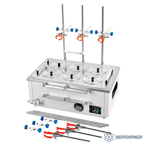 - Шесть рабочих мест диаметром 110 мм с пятью стальными уплотнительными кольцами, штативами и лапками с зажимом.