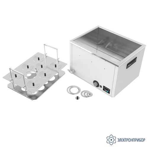 - Система из 5‑ти стальных концентрических колец позволяет уплотнять размещенные в ванне колбы, стаканы и другую лабораторную посуду.
