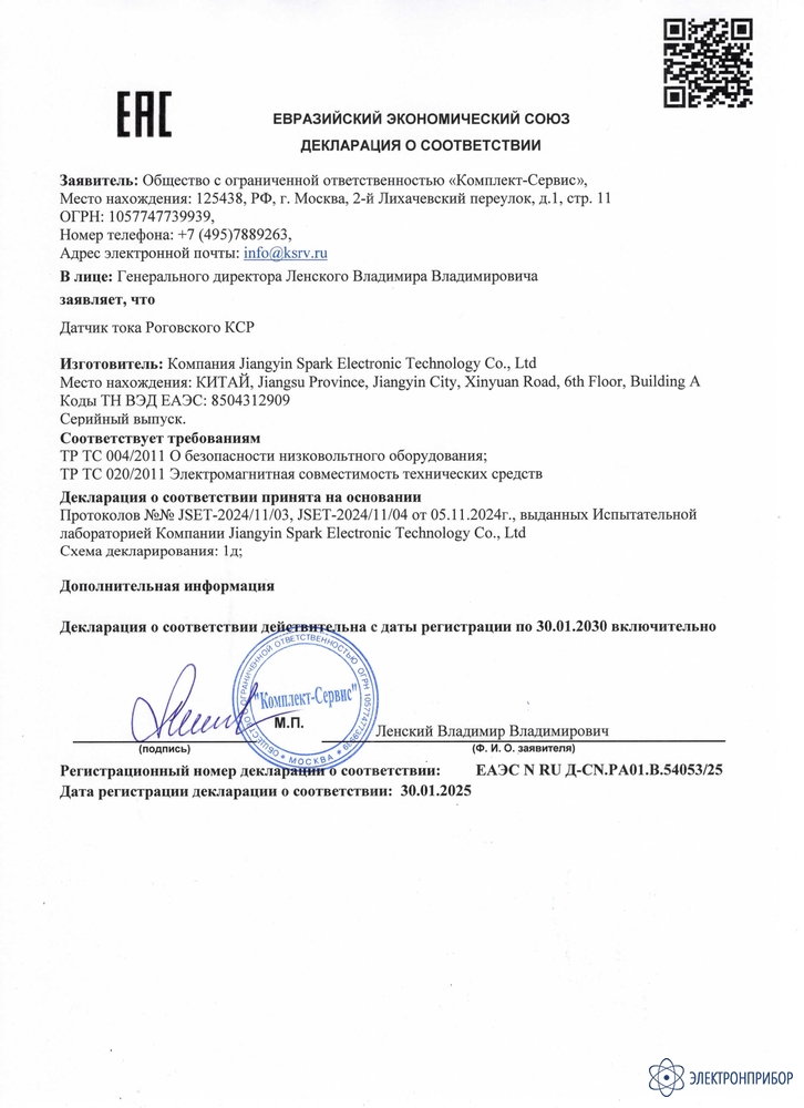 КСР-1 — датчик тока Роговского (номинальное вторичное значение ~5А)