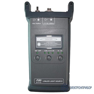 Источник лазерного излучения FOD-2113 предназначен для использования в составе измерительных комплектов для определения затухания в волоконно-оптических линиях связи в качестве генераторов непрерывного оптического излучения. Источник обеспечивает излучаемую оптическую мощность не менее -3 дБм(0.5 мВт) в многомодовом и одномодовом волокне на длинах волн 850,1310, 1550 нм. Имеется режим пониженного потребления. FOD-2113 обеспечивает работу на трёх длинах волн: 1310 и 1550 нм на одном выходе и 850 нм 10мкВт на другом. В источнике имеется индикатор пониженного напряжения. Источник поставляется со сменным адаптером, блоком питания (зарядным устройством), резиновым ударозащитным кожухом и мягким чехлом.