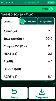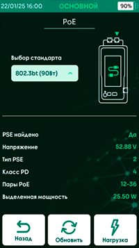 При наличии в тестируемой линии источника PoE (PSE), прибор также покажет результаты тестирования PoE: