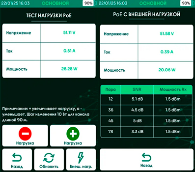 Тестирование с внешней нагрузкой в реальном времени может быть полезно при диагностике нестабильной работы высокоскоростных каналов с PoE (2,5 / 5 / 10 Гбит/с). Например, когда характеристики линии "плывут" с течением времени из-за перегрева кабеля, возникающего в следствии больших токов PoE.