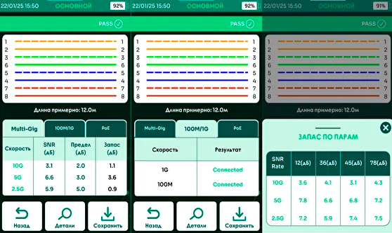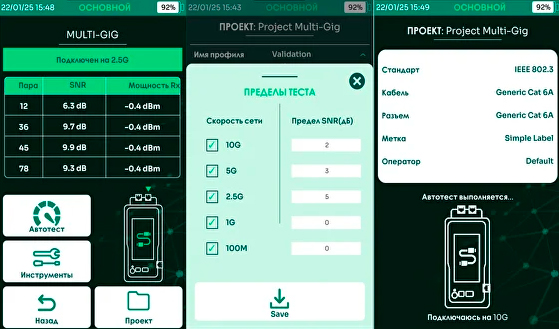 При включении режима Multi-Gig, тестер автоматически подключается на скорости 2,5 / 5 / 10 Гбит/с (если это возможно) и выводит на экран данные об SNR и Мощности Rx каждой пары. До проведения основного тестирования, появляется возможность настроить Ваш проект - указать тестируемый стандарт, параметры кабеля и разъёма. А также внести пределы SNR для каждой скорости соединения.