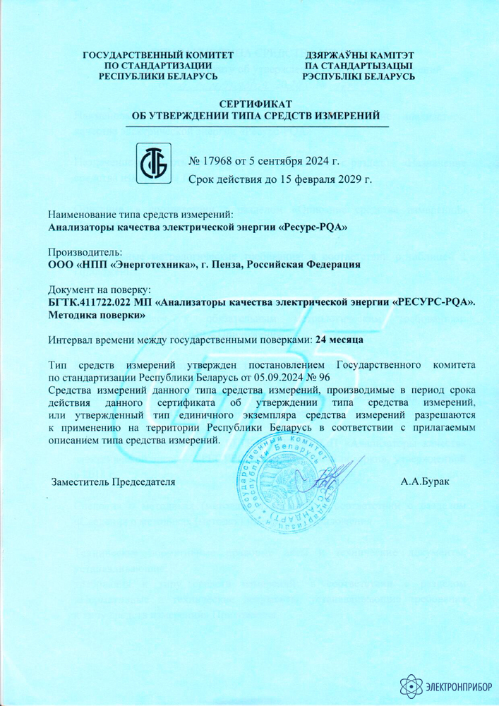13) Реактивная электрическая энергия (для реактивной электрической мощности, рассчитываемой по формуле Q = √S2 − P2), реактивная электрическая энергия основной частоты и реактивная электрическая энергия прямой последовательности.ОБЩИЕ ХАРАКТЕРИСТИКИ Параметры электрического питания от сети переменного тока Расширенный рабочий диапазон, В 1) от 86 до 440 Предельный рабочий диапазон, В 2) от 0 до 500 Частота, Гц от 42,5 до 69 Параметры электрического питания от источника постоянного тока Расширенный рабочий диапазон напряжения, В 1) от 80 до 550 Предельный рабочий диапазон напряжения, В 2) от 0 до 600 Параметры электрического питания от NiMH аккумулятора (аккумуляторной батареи) приборов Номинальное напряжение аккумулятора, В 7,2 Номинальная ёмкость аккумулятора, мАч 3800 Потребляемая мощность, ВА При заряженном аккумуляторе (без заряда аккумулятора), не более 25 При заряде аккумулятора, не более 50 Входное сопротивление по измерительным входам напряжения, МОм, не менее 1 Входное сопротивление по входам для подключения измерительных преобразователей тока, кОм, не менее 50 Время установления рабочего режима, мин, не более 3 Время непрерывной работы (при электропитании от сети переменного тока или от источника постоянного тока) Круглосуточно Габаритные размеры (ширина х высота х глубина), мм, не более Pecypc-PQA-М 270 x 255 х 105 Pecypc-PQA-L 240 х 80 х 185 Масса, кг, не более Pecypc-PQA-М 2,6 Pecypc-PQA-L 2,0 Нормальные условия измерений Нормальное значение температуры окружающего воздуха, °C +20 Допускаемые отклонения от нормального значения температуры окружающего воздуха, °C +10 и -5 Относительная влажность воздуха, %, не более 80 Атмосферное давление, кПа (мм рт.ст.) от 80,0 до 106,7 (от 600 до 800) Напряжение питающей сети переменного тока, В 220 ± 22 Частота питающей сети переменного тока, Гц 50,0 ± 0,5 Коэффициент искажения синусоидальности переменного напряжения питающей сети, %, не более 12 Рабочие условия измерений Температура окружающего воздуха, °C, Pecypc-PQA-М от -20 до +45 Температура окружающего воздуха, °C, Ресурс-PQA-L (без аккумулятора) от -40 до +55 Температура окружающего воздуха, °C, Ресурс-PQA-L (с аккумулятора) от -20 до +55 Относительная влажность воздуха при температуре окружающего воздуха +30 °C, %, не более 95% Атмосферное давление, кПа (мм рт.ст.) от 70,0 до 106,7 (от 537 до 800) Средний срок службы, лет, не менее 25 Средняя наработка на отказ, ч, не менее 125000 Сопротивление изоляции между корпусом и электрическими цепями приборов, МОм, не менее В нормальных условиях измерений 20 При температуре окружающего воздуха +30 °C и относительной влажности воздуха 95 % 5 1) Диапазон напряжения электрического питания, в котором обеспечивается функционирование приборов в соответствии с их назначением с установленными метрологическими характеристиками.