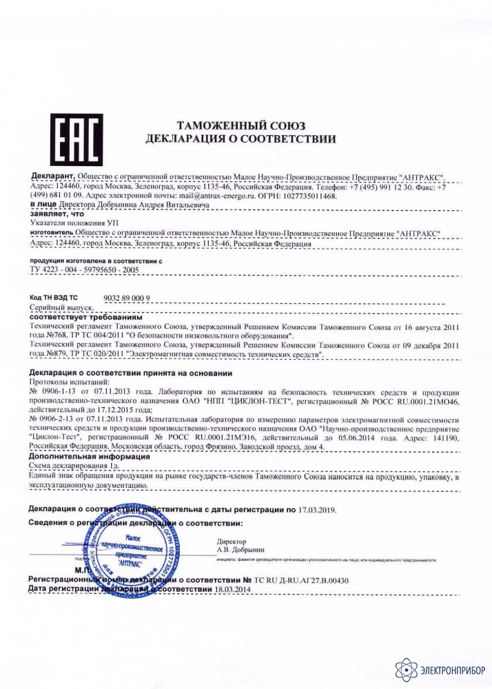 Технические характеристики указателя положения привода УП-41: