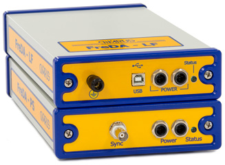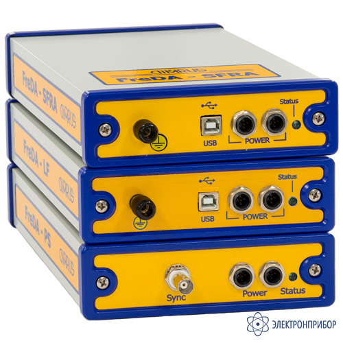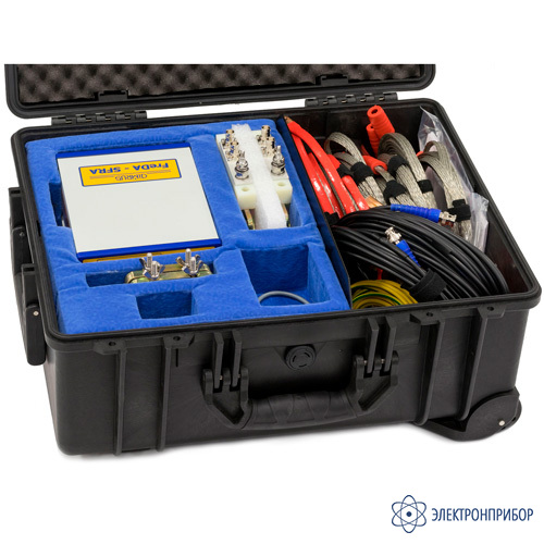 В программном обеспечении прибора FreDA-LF реализован алгоритм определения влагосодержания в целлюлозе обмоток трансформатора, работающий на основе анализа зависимости тангенса угла потерь в изоляции от частоты. Конструктивное исполнение прибора контроля частотных характеристик изоляции FreDA:Прибор состоит из трех электронных модулей одинаковой конструкции: двух измерительных и универсального блоков сетевого питания с встроенными аккумуляторами. В зависимости от решаемой диагностической задачи используется или низкочастотный модуль FreDA-LF, или высокочастотный FreDA-SFRA. Выбранный диагностический модуль подключается к блоку питания и при помощи входящего в поставку комплекта соединительных проводов подключается к вводам контролируемого трансформатора. Передача информации между измерительными модулями и ноутбуком может производиться с использованием двух стандартных интерфейсов: проводного USB или беспроводного Wi-Fi. Для управления прибором используется переносной компьютер и программа для ОС Windows. Программа поставляется вместе с прибором бесплатно. В программе заведены схемы соединения, согласно IEEE Std C57.149-2012 «IEEE Guide for the Application and Interpretation of Frequency Response Analysis for Oil-Immersed Transformers». Состав прибора контроля частотных характеристик изоляции FreDA:В состав полной поставки измерительного прибора FreDA входят: - Высокочастотный измерительный модуль FreDA-SFRA.