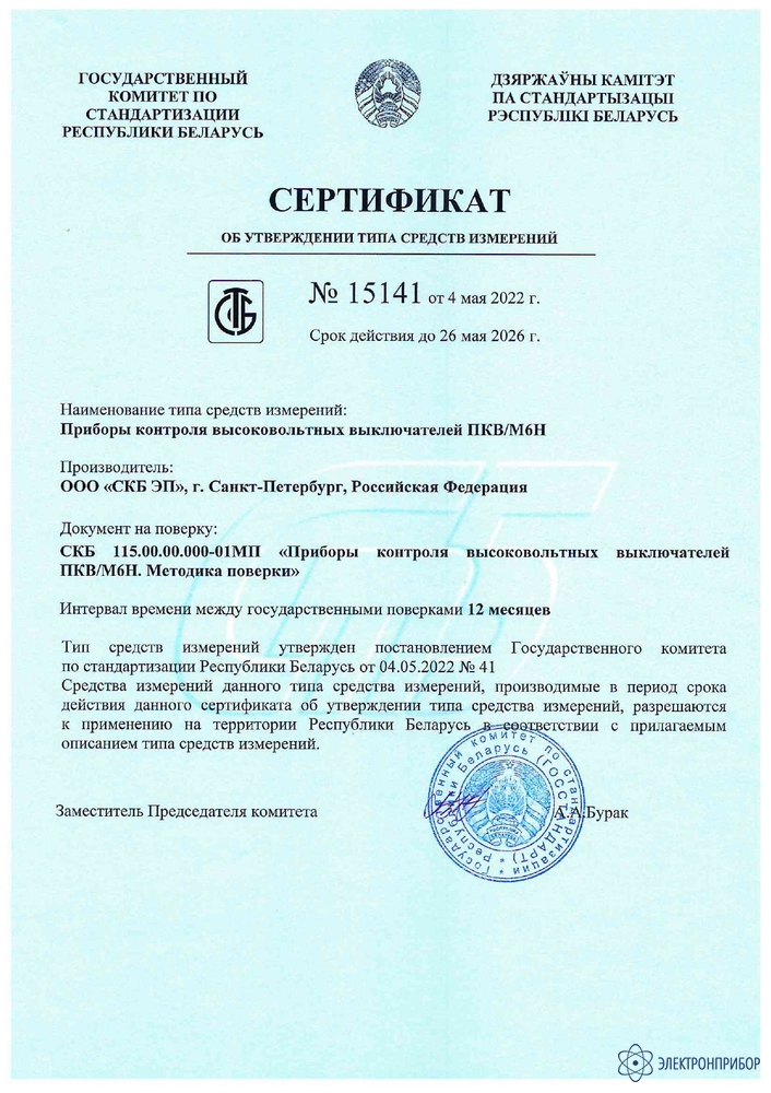 Комплект поставки ПКВ/М6Н облегченная комплектация№ Наименование, Индекс Применение Фото ПКВ/М6Н Стандартная комплектация ПКВ/М6Н Облегченная комплектация 1 Измерительный блок ПКВ/М6Н СКБ015.00.00.000 Прибор и сопроводительная документация: сертификат о калибровке, руководство по эксплуатации, формуляр, инструкция по проведению измерений на различных типах выключателей.  1 1 2 Датчик линейного перемещения ДП12 СКБ012.04.000 Для измерения линейного перемещения подвижной части высоковольтного выключателя (в комплекте паспорт и сертификат о калибровке). Диапазон 0 ÷ 900 мм. Разрешение 0,5 мм. Используется совместно с измерительным стержнем.  1 - 3 Стержень измерительный с футляром СКБ010.15.00.000-02 Стержень измерительный в футляре. Используется совместно с датчиком линейного перемещения ДП12 (длина 700 мм. // по заказу 550 мм. и 1000 мм.).  1 - 4 Датчик углового перемещения ДП21 СКБ009.00.00.000 Для измерения угла поворота вала высоковольтного выключателя (в комплекте паспорт и сертификат о калибровке). Диапазон измерений 0 ÷ 360°. Разрешение 0,09°.  1 - 5 Кабель датчика СКБ015.10.00.000-01 Для подключения датчика линейного (ДП12) или углового перемещения (ДП21) к прибору. Изоляция кабеля силикон (длина 7 м. По заказу 12 м.).  1 - 6 Кабели полюсов. Полюс А, В, С СКБ015.11.00.000/-01/-02 Для подключения к полюсу высоковольтного выключателя. Оканчиваются наконечниками типа "крокодил". Изоляция - силикон. Зев Ø 30 мм. (длина 11 м.).  3 3 7 Наконечники под винт М5 СКБ021.26.00.003 Для подключения к приводу высоковольтного выключателя, если неудобно подключаться "крокодилами" к винтам колодки привода.  4 4 8 Кабель сетевой СКБ018.09.00.000 Для подключения прибора к сети питания. Температурный диапазон -25°С ÷ +45°С. Резиновая изоляция (длина 2 м.).  1 1 9 Кабель дистанционного пуска СКБ015.13.00.000 Для дистанционного запуска прибора на измерения. Подключается к приводам электромагнита высоковольтного выключателя. Резиновая изоляция (длина 5 м.).  1 1 10 Комплект крепежных приспособлений для выключателей российского производства Для крепления датчиков ДП12 и ДП21 к различным типам высоковольтных выключателей российского производства (зажимы, площадки, переходники и пр.).  1 - 11 Бумага для касс Термолента (длина 57/40 м.).  1 1 12 Предохранители ВП2Б-1В-2А Для защиты источника питания.  2 2 13 Сумка СКБ126.06.02.000 Для крепежных изделий.  1 - 14 Сумка СКБ126.06.00.000 Для прибора и комплектующих.  1 1