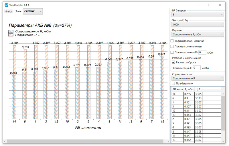 - Измеренные значения сохраняются во внутреннюю память. С помощью бесплатного ПО Chartbuilder результаты измерений можно визуализировать в виде гистограмм. Удобно для сортировки и подбора элементов для сборных АКБ (параметры такой сборки определяются параметрами «худшего» элемента). Также ПО Chartbuilder позволяет рассчитать разброс между крайними значениями R (внутреннего сопротивления).