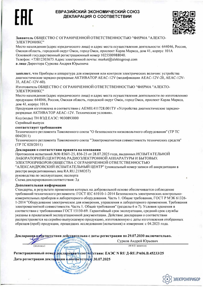 Активатор АЕАС-12V предназначен для воспроизведения силы постоянного тока для заряда аккумуляторов и батарей, формирования нагрузочного сопротивления электрическому току при разряде аккумуляторов и батарей, измерения силы зарядного и разрядного тока, измерения напряжения аккумуляторов и батарей.