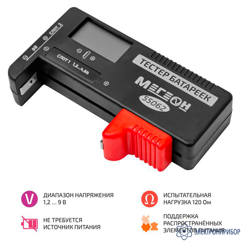 Технические характеристики тестера батареек и аккумуляторов МЕГЕОН 55062: