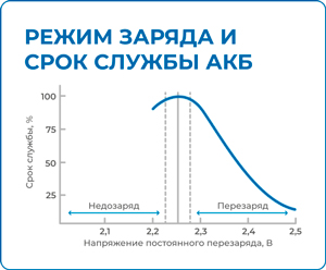 На рисунке изображено, как быстро уменьшается срок их службы при работе в режиме постоянного подзаряда при повышении напряжения источника питания, подключённого к АКБ.