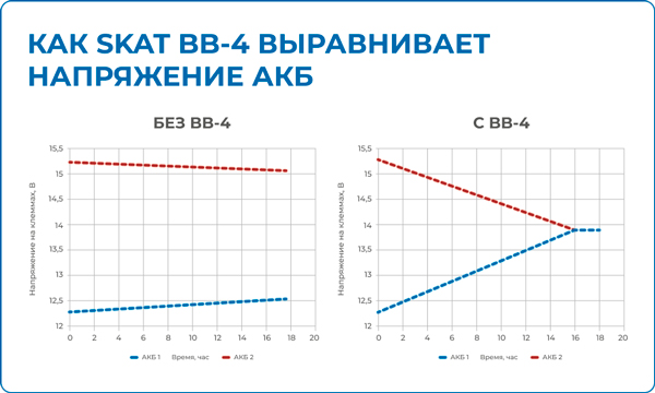 При продолжительном перезаряде с завышенным напряжением происходит быстрая деградация АКБ. Недозаряд так же вреден для свинцово-кислотных батарей, как и перезаряд. Он приводит к сульфатации (процессу окисления и кристаллизации) пластин батареи. При многократных недозарядах уменьшается разрядная ёмкость и понижается срок службы АКБ. Применение SKAT BB-4 (26-200) Ah позволяет продлить срок службы АКБ за счёт автоматического выравнивания напряжения на клеммах АКБ. На рисунке 2 изображено сравнение изменения напряжения на клеммах АКБ1 и АКБ2 с течением времени – с использованием SKAT BB-4 (26-200) Ah и без него.