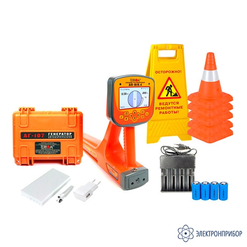 № Наименование Количество 1 Трассопоисковый приемник АП-019.4 1 2 Генератор АГ-107 1 3 Устройство зарядное АГ107.02.010 1 4 Кабель АГ120.02.020 1 5 Кабель АГ120.02.050 1 6 Кабель АГ105.02.020 1 7 Контакт магнитный АГ120.02.090 2 8 Штырь заземления АГ110.02.004 2 9 Акумуляторы 26500 4 10 Кабель USB 2,0 AM-mini USB 1 м 1 11 Power bank, 10 000 mAh 1 12 Конус дорожный, высота 30 см 5 13 Аварийный знак "Люк открыт" или "Идут работы" 1 14 Зарядное устройство HD-8992A 1 15 Сумка для приемника (чехол 53212) 1 16 Сумка для комплекта (чехол 53222) 1 17 Руководство по эксплуатации 3 18 Паспорт 1 -