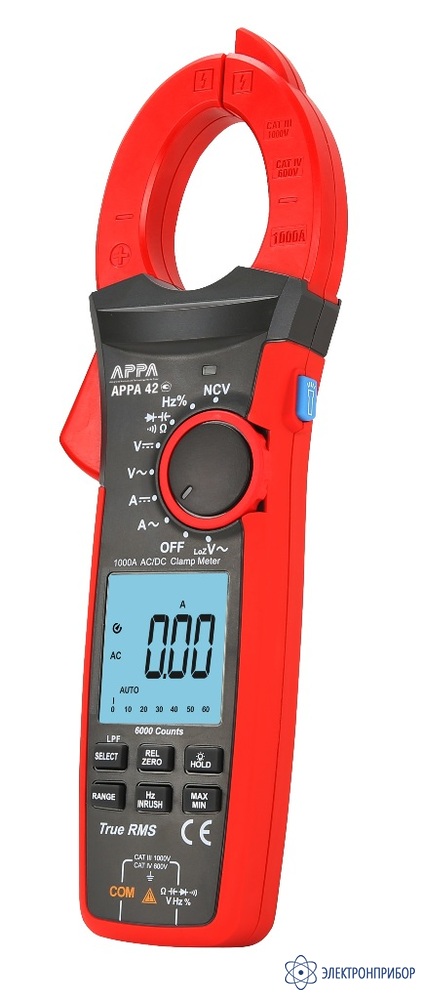 Параметр Значение Измерение силы переменного тока (ACA ТRMS) Пределы измерений 60 / 600/ 1000 А Разрешение 0,01/ 0,1/ 1 А Погрешность измерений* ± (2,0 % + 9 е.м.р) до 60 А