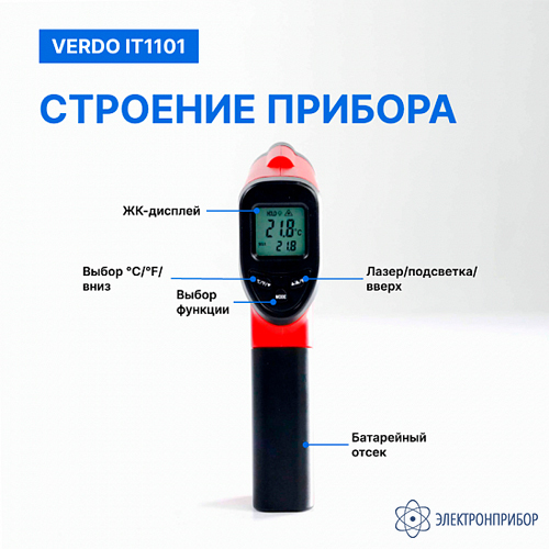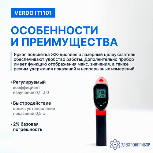 Особенности пирометра портативного (-50…380°С)/(±2% или ±2°С); DS=12:1; k=0,1…1,0; 1 лазер VERDO IT1101: