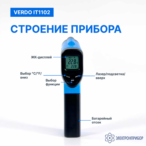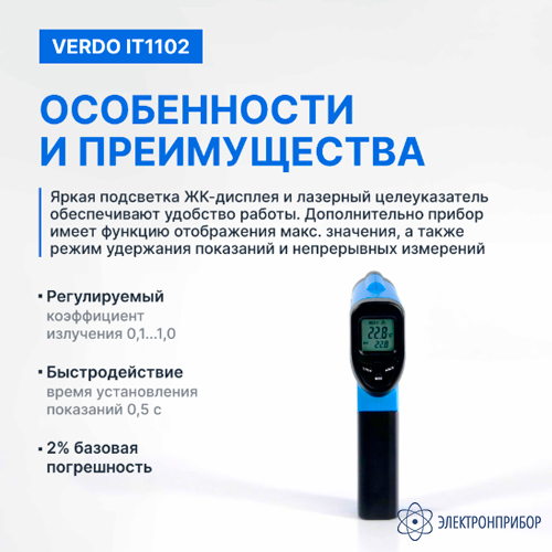 Особенности пирометра портативного (-50…550°С)/(±2% или ±2°С); DS=12:1; k=0,1…1,0; 1 лазер VERDO IT1102: