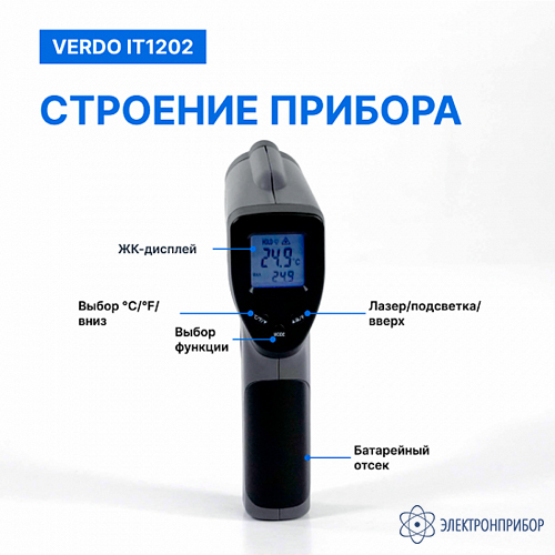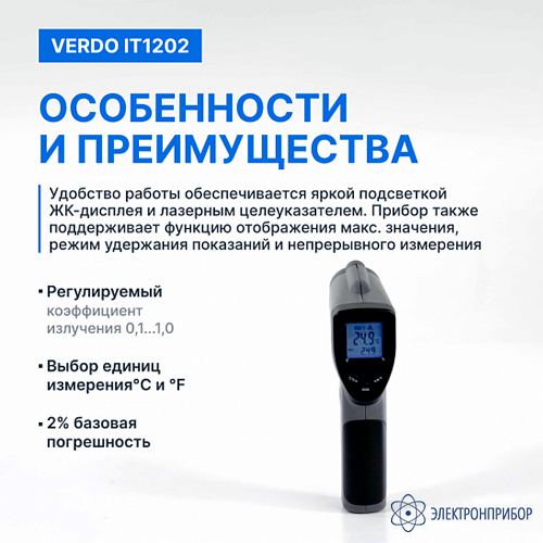 Особенности пирометра портативного (-50…550°С)/(±2% или ±2°С); DS=12:1; k=0,1…1,0; 1 лазер VERDO IT1202: