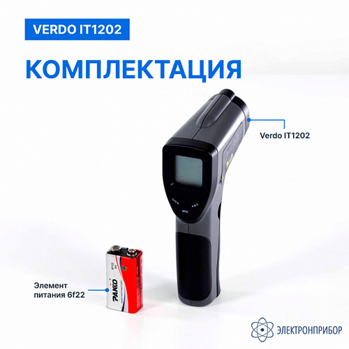 № Наименование Количество 1 Пирометр портативный (-50…550°С)/(±2% или ±2°С); DS=12:1; k=0,1…1,0; 1 лазер VERDO IT1202 1 2 Элементы питания типа 6F22 1 -