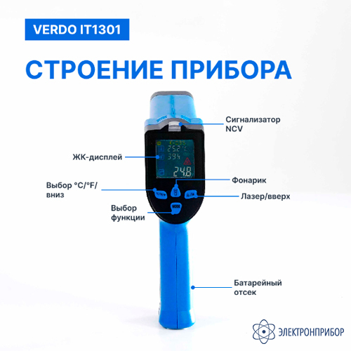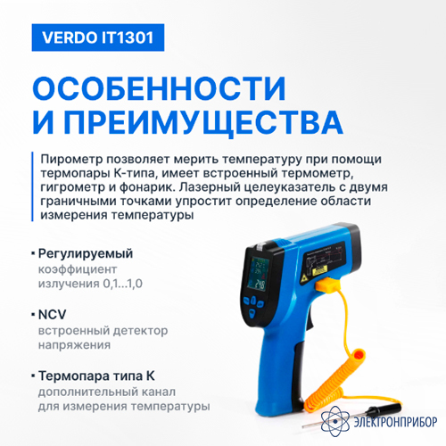 Особенности пирометра портативного (-50…550°С)/(±2% или ±2°С); DS=12:1; k=0,1…1,0; 2 лазера VERDO IT1301: