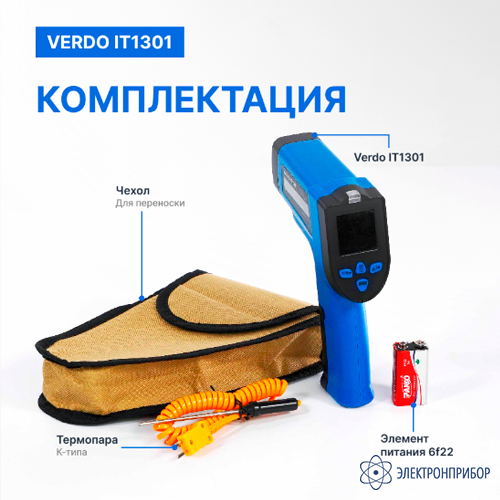 № Наименование Количество 1 Пирометр портативный (-50…550°С)/(±2% или ±2°С); DS=12:1; k=0,1…1,0; 2 лазера VERDO IT1301 1 2 Термопара К-типа 1 3 Элемент питания типа 6F22 1 4 Чехол для переноски 1 -