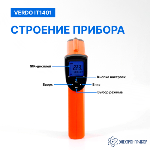 Инфракрасный пирометр Verdo IT1401 – бесконтактный измерительный прибор, предназначенный для быстрого и точного определения температуры поверхности различных объектов. Он использует инфракрасную технологию для обнаружения и анализа инфракрасного излучения, испускаемого объектом, и преобразует его в электрические сигналы для отображения температуры на цифровом дисплее.